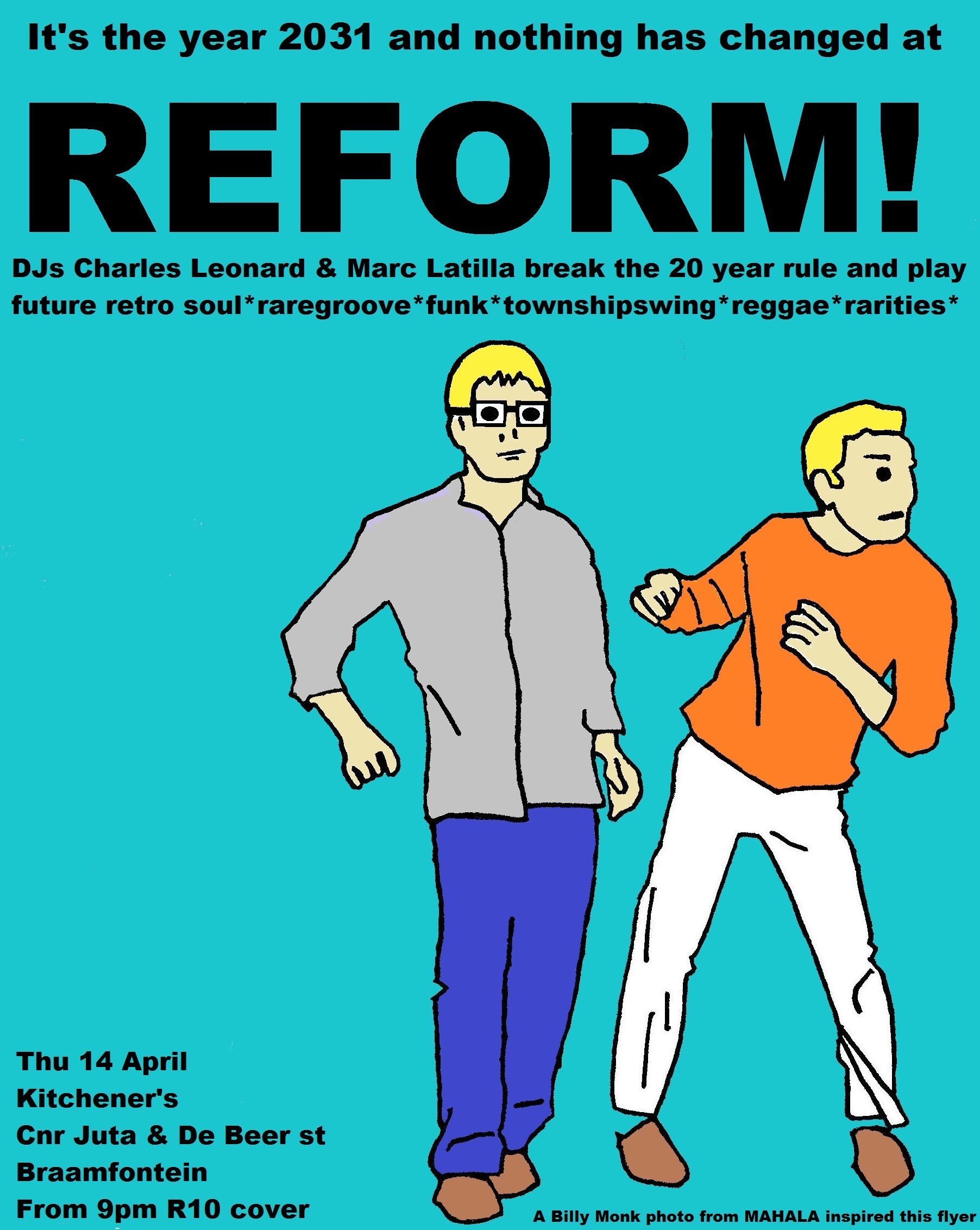 REFORM! started in Nov 2009 with Charles Leonard. It was a regular party at KITCHENERS in Braamfontein where we played a 6-decade spanning selection of soul*raregroove*girlgroups*townshipjive*reggae*swingjazz*nigeria70s*vintagedisco*newwave*springbokradiohits*indie. We also did a vinyl only gig at 44 Stanley Ave for some time.