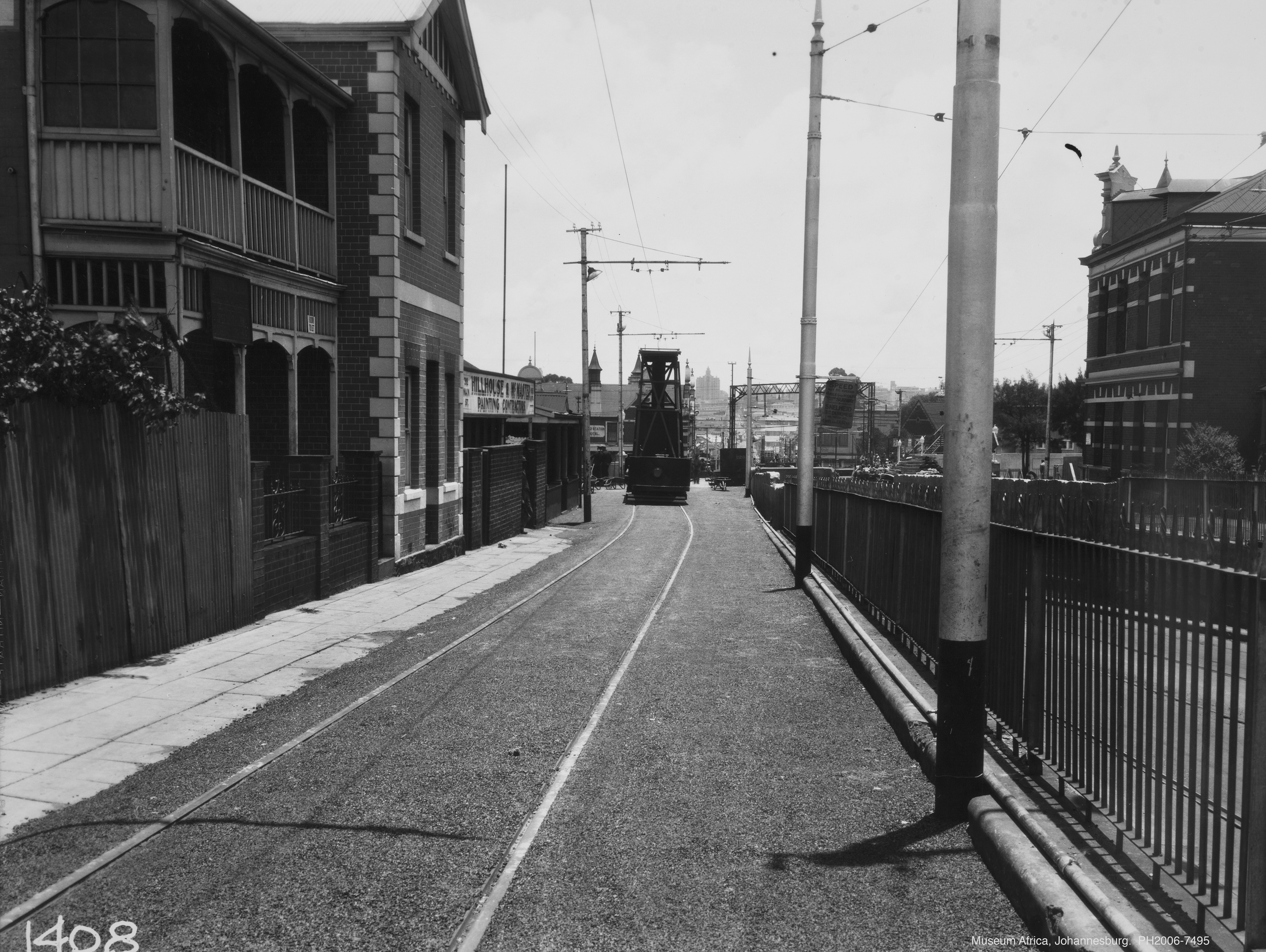 Of interest are these pictures I found in the Africana Museum Archives showing tram lines running under the train lines (when they were still on street level). Grand Central Hotel, also famously known as Norman’s Grill, is in the background. Today, the tram lines are gone and the train lines run underground. This whole picture seems like it’s from another city. It’s probably from around the mid-1930s as the construction to lower the train tracks appears to have started around 1936 and completed just before WW2 (the street level crossings around Jeppe Station caused major traffic upsets and accidents).